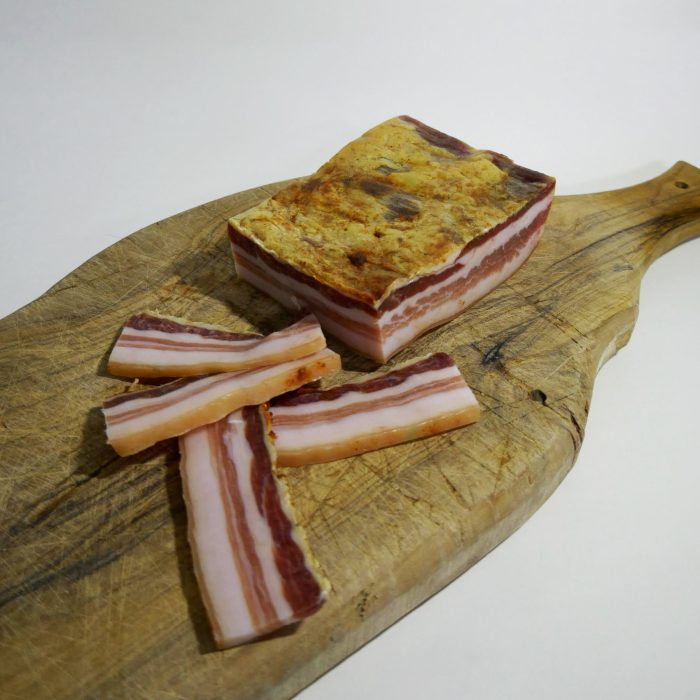 Preparata con carne suina lucana, sale, peperone dolce e aromi naturali, questa pancetta viene lavorata artigianalmente e stagionata con calma. La scelta di ingredienti semplici e locali permette di ottenere un prodotto pulito, sincero, dove la dolcezza del peperone accompagna la carne senza sovrastarla.